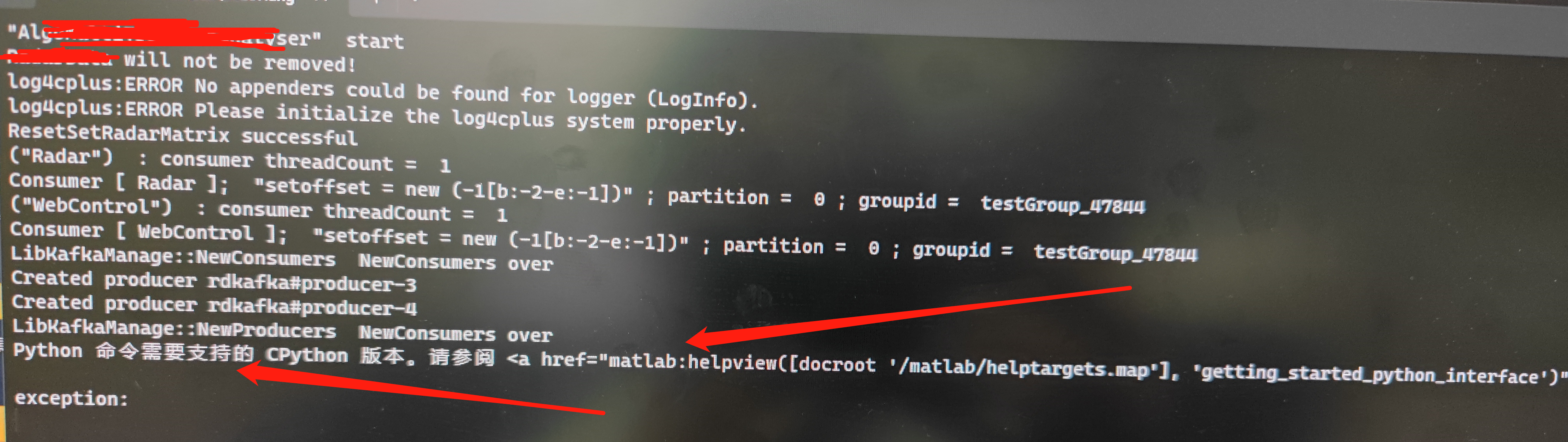 # 说明 Python 命令需要支持的 Cpython 版本。请参阅 <a href="matlab:helpview([docroot'/matlab/helptargets.map’]...  这个错误吧,很少见,而且网上说明的也不多。 其实根本错误跟python的环境有关系。 我是c++调用matlab转成c++的共享库,该matlab还通过python engine调用了python脚本... 设置了matlab的路径到环境变量,设置了python的环境变量到python,通过环境变量也只可以找到matlab2021a,和python3.8.6 官网也说明了,matlab2021a与python3.8兼容... 我测试了,通过matlab调用python语句,是ok的。 python setup.py install,安装了python engine 也正常。 matlab的注册表信息也找到,并配置好了... 但是运行c++程序,就会报错。。。 然而,这个真的让我无语。。。 # 解决方案 ==matlab重新生成c++共享库== 通过deploytool重新生成c++库,就可以正常运行了... 至于是为什么,难道python的配置路径,与之前的库的配置路径不一样,所以才出现的问题??? 那这样的话,要不就必须python安装在同一路径下,要不就需要每次重新编译了,如果不在同一路径下的话。   记录一下,以免后面会又出现同样的问题。 编辑:myhappyandy