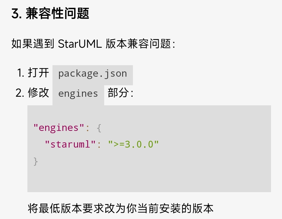 # 说明 设计文档需要,本来是想通过vs2022自动生成类图的,结果使用cmakelist管理的工程好像无法自动生成,只能是sln解决方案才行。没有办法才想着用StarUML工具来生成类图。 我这里StarUML是3.0版本,想着是不是可以下载一个c++插件,通过读取cmakelist工程,自动生成类图啥的。于是一搜插件,还真有。 # 解决方案 1.下载插件 [https://github.com/staruml/staruml-cpp/releases](https://github.com/staruml/staruml-cpp/releases) 2.解压文件到目录 %Appdata%/Staruml/extensions/user/ 3.重新启动StarUML 即可在Tools菜单下,可以看到C++扩展目录 4.通过菜单Reverse Code浏览c++工程目录 即可自动生成一些类图,但可能不完整,并且缺失一些类名,需要自己补充完整。 可以通过多次打开不同的子工程目录,以建立不同的目录类结构。 能够自己拖入类,自动建立联系。  # 查看兼容性问题 通过查看插件下package.json文件可以看到最小兼容版本  编辑∶myhappyandy