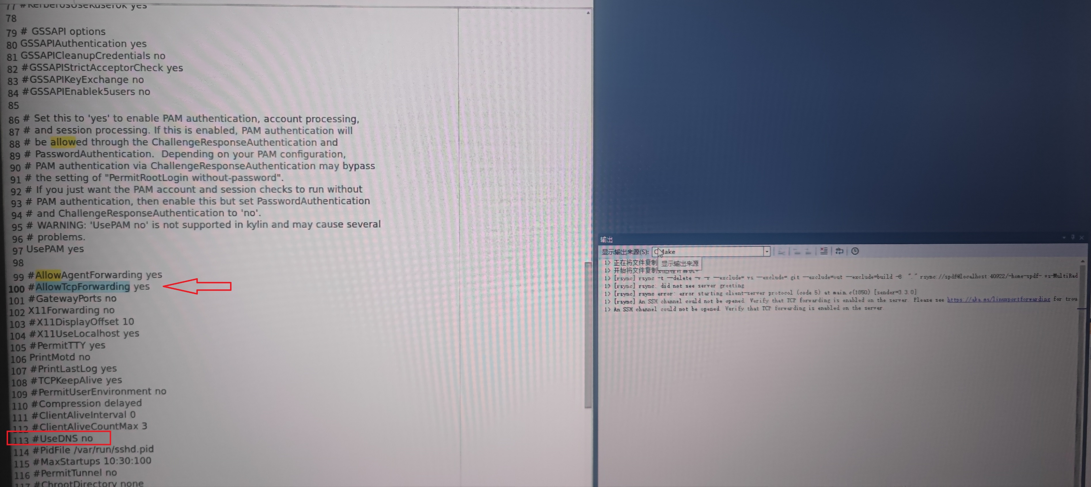 # 说明 vs2022无法与KylinServerV10进行远程调试,但是我用的ubuntu却可以正常调试运行?然后一直出现这个错误:An SSH channel could not be opened. Verify that ICP forwarding is enabled on the server.  后面通过卸载ssh和rsync服务都不行,甚至,卸载这些服务后,系统会出现无法登录系统的情况... # 解决方案 ==解决方法其实比较简单,就是将AllowTcpForwarding yes放开注释即可== 好像之前也测试过,为什么没有生效呢??? ## 打开sshd_config文件修改 ```bash pluma /etc/ssh/sshd_config ``` 然后在第100行去掉注释符号即可! ## 重启服务 ```bash systemctl restart sshd ``` ~~有说需要将UseDNS no 打开,但是好像没有用啊。~~  编辑:myhappyandy
