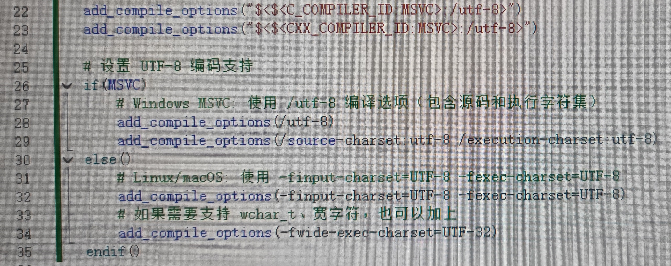 # 情况说明 最开始是用msvc+CMakeList.txt来管理的工程项目,有的工程是通过原有工程项目转换过来,文件使用的编码可能是ASIC码,后面新建的文件大部分是utf-8编码文件。有的中文用QStringLiteral包裹起来,中文显示是正常的。但编译到Linux下时,这部分被包裹的中文会报错,无法编译成功。去除该QStringLiteral后,又会显示乱码。去掉后,在win下编译也会在有中文输入的地方提示“含有常量换行符”,无法编译成功... # 解决方案 ==解决方案就是,将cpp或者h文件全部转为utf-8编码,并在编译指令中显示指定编码为utf-8即可!== ## 转换编码为utf-8 这一部分可以使用python脚本一次性转换所有的文件。参考代码: ```python import os import codecs import chardet def detect_encoding(file_path): """检测文件编码""" with open(file_path, 'rb') as f: raw_data = f.read() result = chardet.detect(raw_data) return result['encoding'], raw_data def convert_file(file_path): """转换单个文件到UTF-8编码""" try: # 检测文件原始编码 encoding, raw_data = detect_encoding(file_path) if not encoding: print(f"警告: 无法检测 {file_path} 的编码,跳过") return # 读取文件内容 try: content = raw_data.decode(encoding) except (UnicodeDecodeError, LookupError) as e: print(f"错误: 解码 {file_path} 时出错时出错 ({encoding}): {str(e)}") return # 统一换统一换行符为LF content = content.replace('\r\n', '\n').replace('\r', '\n') # 以UTF-8编码保存文件 with codecs.open(file_path, 'w', encoding='utf-8') as f: f.write(content) print(f"已转换: {file_path} (从 {encoding})") except Exception as e: print(f"处理 {file_path} 时发生错误: {str(e)}") def process_directory(directory='.'): """递归处理目录中的所有CPP文件""" for root, dirs, files in files in os.walk(directory): for file in files: if file.endswith('.cpp'): file_path = os.path.join(root, file) convert_file(file_path) if __name__ == "__main__": current_dir = os.getcwd() print(f"开始处理目录: {current_dir}") process_directory(current_dir) print("转换完成!") ``` ## 显示指定编译时编码为utf-8 参考写法: ``` cmake_minimum_required(VERSION 3.15) project(MyUtf8Project LANGUAGES CXX) # 创建一个接口库来管理编码设置 add_library(utf8_config INTERFACE) if(MSVC) # Visual Studio / MSVC target_compile_options(utf8_config INTERFACE /utf-8) target_compile_definitions(utf8_config INTERFACE _UNICODE UNICODE ) else() # GCC, Clang, Intel etc. target_compile_options(utf8_config INTERFACE -finput-charset=UTF-8 -fexec-charset=UTF-8 -fwide-exec-charset=UTF-8 ) endif() # 对每个目标应用编码设置 add_executable(my_program main.cpp source1.cpp source2.cpp) target_link_libraries(my_program PRIVATE utf8_config) # 如果是库项目 add_library(my_library STATIC lib_source1.cpp lib_source2.cpp) target_link_libraries(my_library PUBLIC utf8_config) ``` 关键点解释: 对于 MSVC (/utf-8): /utf-8 选项告诉编译器源代码文件和字符串字面量都使用 UTF-8 编码 同时设置 _UNICODE 和 UNICODE 宏启用 Windows Unicode API 对于 GCC/Clang: -finput-charset=UTF-8:指定源文件编码为 UTF-8 -fexec-charset=UTF-8:指定执行时字符集为 UTF-8 -fwide-exec-charset=UTF-8:指定宽字符执行字符集为 UTF-8  至此,能够使得中文编译和显示是正常的。 编辑:myhappyandy